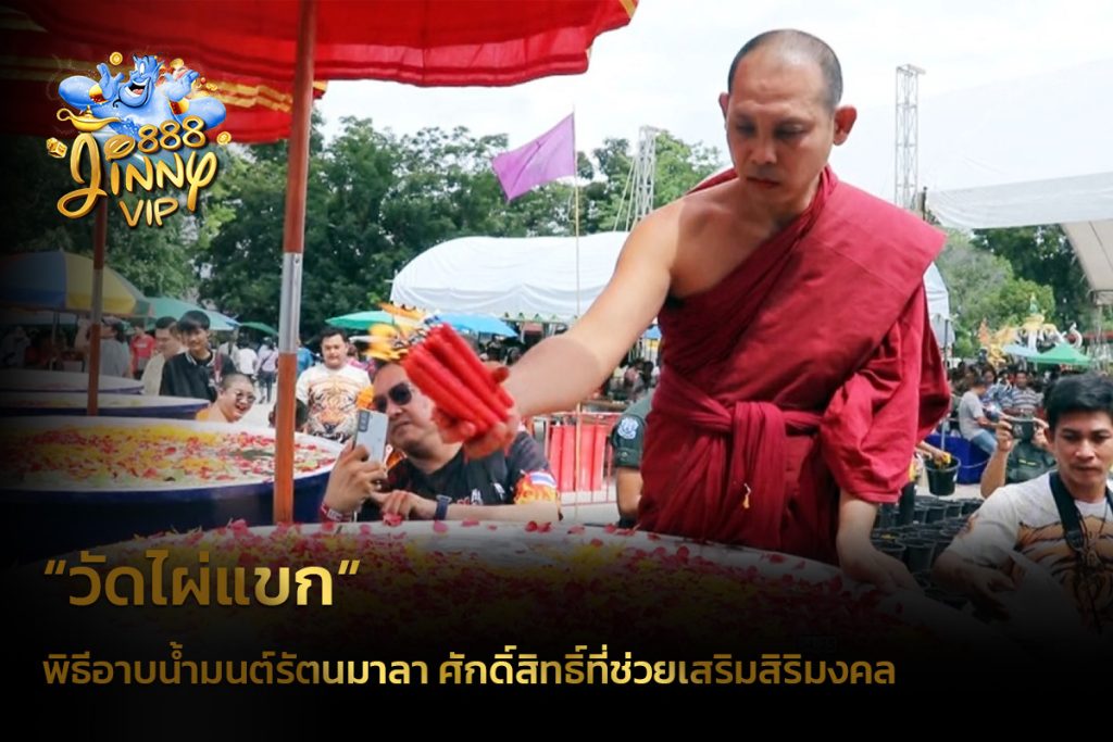 พิธีอาบน้ำมนต์รัตนมาลาเป็นหนึ่งในพิธีกรรมที่ชาวพุทธให้ความเชื่อถือเป็นอย่างมาก โดยเชื่อว่าสามารถเสริมสิริมงคล ปัดเป่าความโชคร้าย และดึงดูดโชคลาภมาสู่ผู้ที่เข้าร่วม หลวงปู่ดุสิต สุจิณโณ แห่งวัดไผ่แขกเป็นผู้ประกอบพิธีนี้ โดยท่านจะบริกรรมคาถาลงในแท็งก์น้ำมนต์ที่มีกลีบบัว ดอกดาวเรือง ผลมะกรูด และหยดน้ำตาเทียน เพื่อเพิ่มความศักดิ์สิทธิ์ หลังจากนั้นพระสงฆ์ 5 รูปจะทำการรดน้ำมนต์แก่ผู้ร่วมพิธี
